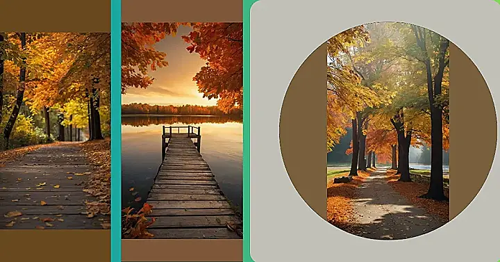 The picture shows a magical pathway winding through a forest. The leaves have turned a beautiful shade of gold, and they’re scattered like confetti across the ground. It almost looks like a fairytale! You can imagine yourself crunching through the fallen leaves, the air crisp and cool, as you walk towards the misty lake in the distance.