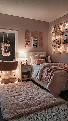 And when you’re done dazzling, this space totally transforms into the ultimate hangout spot! Reflected in the mirror, you can spot twinkly fairy lights that make everything feel super magical and cozy – perfect for late-night chats with your besties or just unwinding with your favorite playlist. With fluffy pink pillows and a vibe that screams “comfort meets chic,” it’s the kind of room where you can be yourself, dream big, and maybe even film an epic TikTok. Who needs a fancy getaway when your own room looks this good and feels like a warm hug?