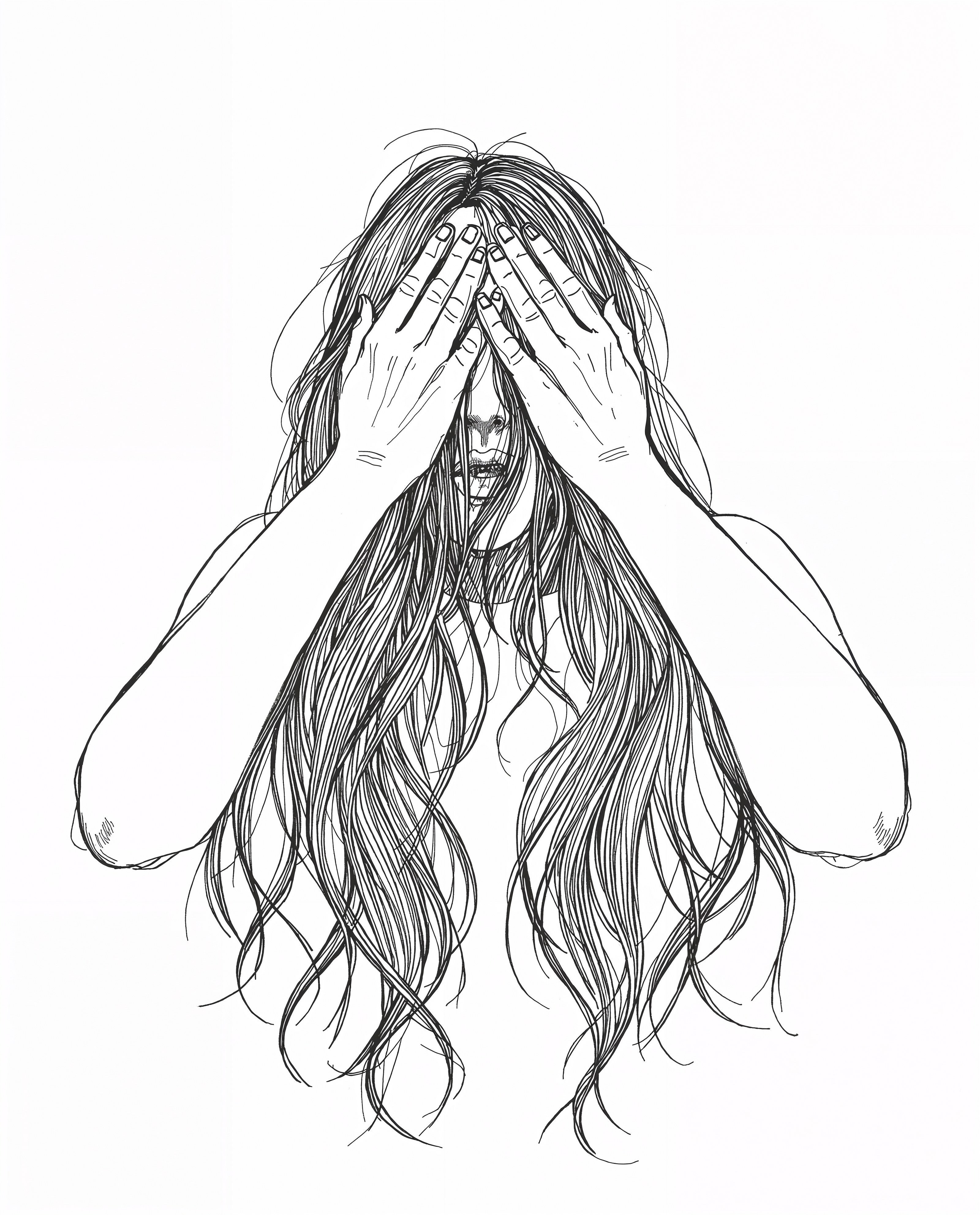 Capture dynamic character movement with this unsettling pose reference sketch, featuring a figure with hair dramatically falling forward. The stark white background emphasizes the clean linework and the expressive flow of the strands.