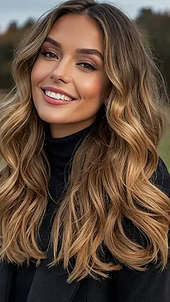 This girl’s hair is seriously giving us major hair envy! It’s like she just rolled out of bed looking absolutely flawless. The “bronde” balayage, a mix of brown and blonde, adds dimension and depth, making her hair look super lush and healthy. It’s like a perfect blend of sunshine and autumn leaves, all in one gorgeous mane! It’s no wonder she’s smiling so big – she’s rocking a hairstyle that’s totally on trend and flattering.