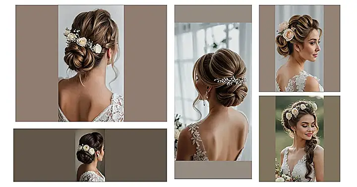 This hairstyle is seriously gorgeous! Imagine walking down the aisle, feeling like a princess with this elegant floral bun. It’s got that perfect mix of fancy and fun – sparkly hair pieces and delicate flowers. It’s like your hair decided to go to a wedding and invited all its best sparkly and flowery friends! This bridal floral bun is not just a hairstyle, it’s a statement!