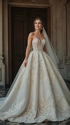 Check out this incredible ivory wedding dress! It’s got so much beautiful lace and flowy fabric, it looks like it could float down the aisle all by itself. Wearing something this stunning must feel like you’re starring in your own fairy tale, complete with a train that probably needs its own bodyguard just to keep it untangled from enthusiastic flower girls or rogue confetti. It’s the kind of dress that makes you feel like a total queen, ready to conquer the world (or at least the dance floor).