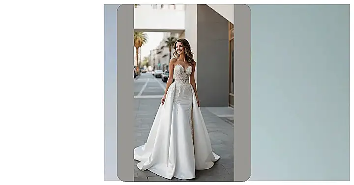 That strapless design and the lacy details on the dress from the picture are totally on point for a classic vibe. And check out that sparkly belt – it’s like the cherry on top of a beautiful, non-edible cake. Wearing something this stunning must make you feel like you’re floating, or at least like you could totally ace a dramatic slow-motion walk down an aisle, probably with a bouquet that smells amazing.
