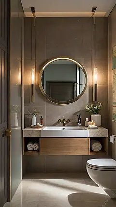 Imagine this: you walk into your bathroom and suddenly you’re not just brushing your teeth, you’re transported to a fancy spa! This bathroom’s got the whole chill vibe going on, with the warm lighting and cute little plants that look like they’re just as relaxed as you’re about to be. It’s so zen, you might accidentally start meditating on the toilet!