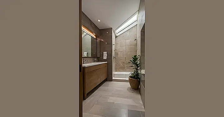 Imagine walking into this bathroom after a long day of school, homework, and maybe even a sports practice. It’s like stepping into a chill spa, minus the cucumber water and questionable robe. The warm tones, sleek surfaces, and that cool skylight above the shower just scream “relaxation station.” Forget bubble baths, you could probably just stand there staring at the tiles and feel your stress melt away faster than ice cream on a hot day.