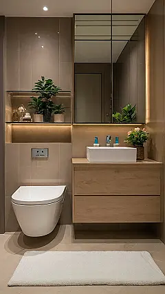 That plant in the corner? Total game changer! It’s like the room said, “I’m sophisticated, but also, I care about oxygen.” Seriously, though, it adds a nice pop of green against all the neutral colors, making the whole space feel fresh and inviting. You might even be tempted to start watering it regularly… or at least until your mom reminds you. This bathroom isn’t just a place to wash up; it’s a mini escape from reality, right inside your own home.