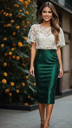 Staring into your closet like it’s a black hole before a holiday party? Don’t stress! This outfit is basically your style superhero. Picture this: a gorgeous lace top that says “I tried just enough” paired with a stunning emerald green skirt that screams “festive but make it fashion.” It’s the perfect mix of fancy and fun, letting you grab all the yummy snacks without feeling overdressed or like you’re blending into the tinsel. This look is all about feeling comfy, confident, and ready to make some epic holiday memories!