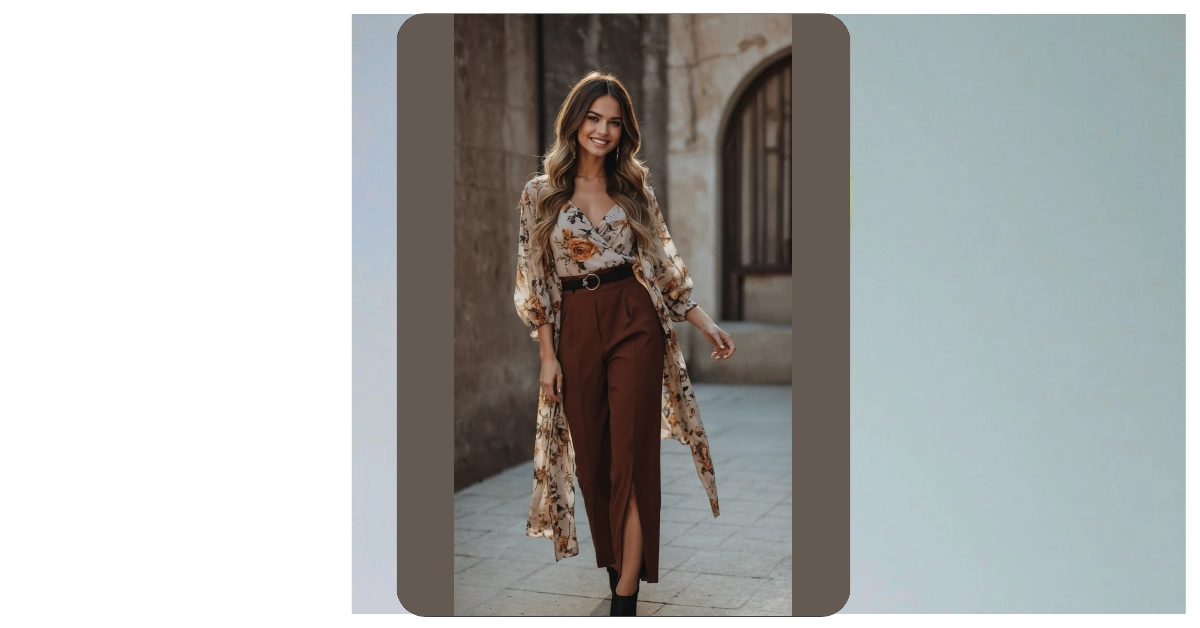 Check out this look that’s ready to conquer any holiday gathering! Those flowy floral layers? They totally give off ‘I woke up like this, but also spent exactly the right amount of time looking effortlessly cool.’ And the best part? Pants! No awkward dress adjustments or worrying about a gust of wind at the entryway. You can actually dance, mingle, and maybe even sneak a second cookie without feeling squeezed.
