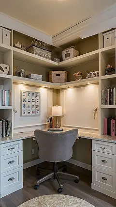 This craft room office looks super organized, unlike my backpack after a week of school. Check out all those shelves! They’re like little landing pads for all your crafty supplies, from glitter glue that will inevitably end up everywhere, to that one roll of washi tape you bought and never used. But hey, at least it *looks* good up there, right?