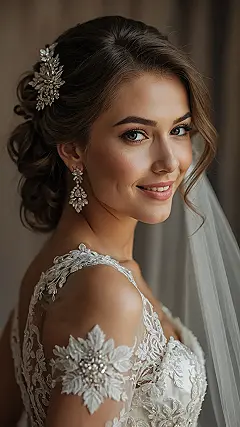 Let’s be real, this whole look is giving major “future me” vibes for anyone dreaming of their own big day! Not only is her hair styled to perfection with those dreamy waves and that elegant bun, but it’s also rocking a super cool, sparkly hairpiece that looks like tiny diamonds are just chilling in her locks. Paired with those delicate earrings and the stunning lace detail on her dress, it’s the kind of romantic wedding style that makes you feel like you just stepped out of a movie. Pretty sure even Prince Charming would be impressed, and probably a little jealous of her perfect hair day!