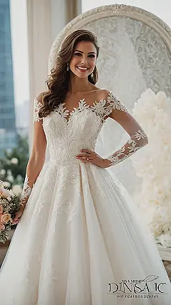 Check out this dress! Those lace sleeves are so detailed, it’s like they were sewn by actual magical sprites who specialize in making people look like royalty. And the skirt? It’s so flowy and dramatic, you could probably stage a whole theatre production under there, but mostly it just looks absolutely stunning and screams “romantic wedding vibes.” It definitely turns heads and makes you feel like you just stepped out of a really glamorous dream.