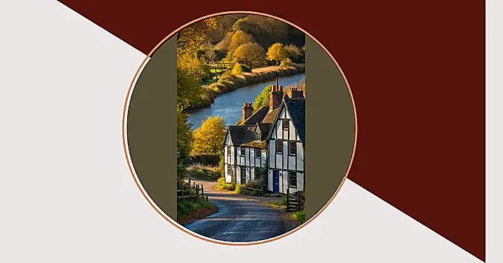 This picture shows off one of those ridiculously charming spots in England that look like they belong on a postcard or a puzzle box. Seriously, those wonky houses with their cool black and white stripes look like they might just wink at you, sitting there all snug by the sparkling river. The trees are basically showing off, wearing their brightest yellow outfits, making everything feel super warm and inviting. It’s the kind of place where you half expect a hobbit to wander out or maybe someone delivering mail by horse – it’s just classic, gorgeous English countryside ready for its close-up.