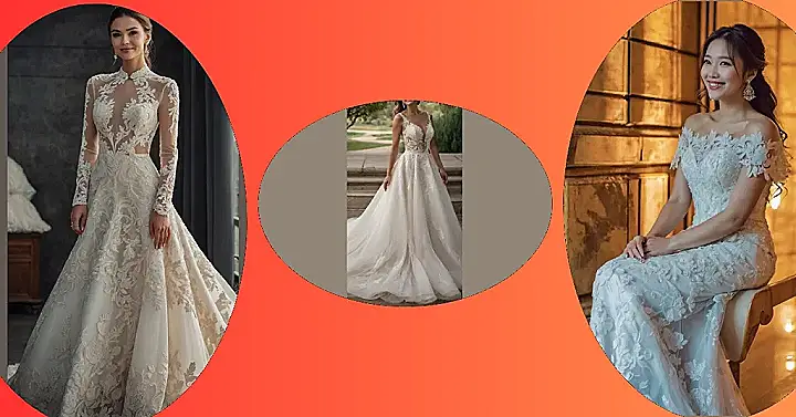 This gorgeous white wedding dress is like something out of a fairytale! Look at all that beautiful lace – it’s like a thousand tiny flowers blooming all over the skirt. The bride looks absolutely stunning, ready to walk down the aisle and say “I do!” It’s the perfect blend of classic elegance and modern style, and honestly, who wouldn’t want to feel like a princess on their wedding day? It even comes with a sparkling tiara! Now that’s what I call a “happily ever after” kind of dress.