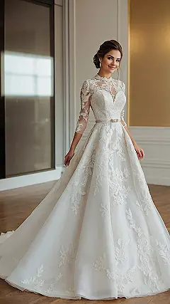 Thinking about walking down the aisle? Check out this dress – it’s like something straight out of a fairy tale! The skirt is HUGE, perfect for twirling, and the sleeves are super cool. They’re like delicate lace tattoos, keeping you covered and classy while still letting your personality shine through. Plus, if the church AC is blasting, your arms won’t turn into popsicles during your vows!