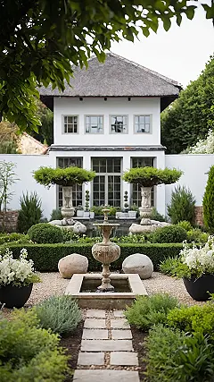 Then you hit the “white” part of the party. There’s this epic white fountain chilling in the background, looking like the fancy centerpiece at a plant prom, totally photobombing all the greenness. And check out those little white flowers and silvery plants scattered around – they add just enough sparkle to make the whole green gang look extra sharp. It’s like the garden got dressed up in its best clean white sneakers to hang out with its cool green crew. You could totally imagine chilling here, maybe trying to count how many different greens you can spot before getting distracted by a squirrel.