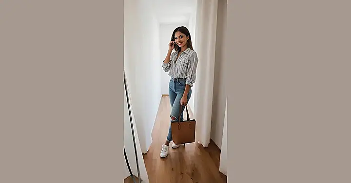 When you nail that perfect balance of comfort and style, a mirror selfie is practically a requirement, right? It’s like saying, “Hello, weekend, I’m here and I’m fabulous!” Whether your plans involve hitting the mall with friends, grabbing some takeout, or just lounging around feeling extra, this look has you covered. Plus, those clean white sneakers mean you’re ready for spontaneous adventures (or just a comfy walk to the fridge). It’s the ultimate ‘I look amazing without even trying’ vibe that perfectly encapsulates pure weekend freedom.