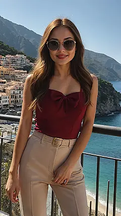 Forget everything you thought you knew about packing for a weekend trip – this person just leveled up the game! Sporting a chic red top with an adorable bow (because who doesn’t love a present, even if it’s just your own outfit?) paired with some super comfy-looking beige pants, it’s clear they understood the assignment: look effortlessly cool while potentially doing absolutely nothing but enjoying that amazing view. This outfit screams “I’m ready for a relaxing stroll, a fancy brunch, or maybe just a serious nap with a great backdrop!”