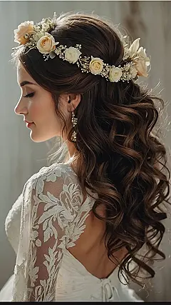 This picture shows a gorgeous hairstyle perfect for a wedding—long, luscious curls topped off with a flower crown! Imagine yourself walking down the aisle, feeling like a total princess with those beautiful creamy white roses and delicate baby’s breath woven into a stunning crown. It’s the kind of look that’s both elegant and fun, so you can dance the night away without worrying about your hair falling out of place. Who needs a tiara when you’ve got this much floral fabulousness?