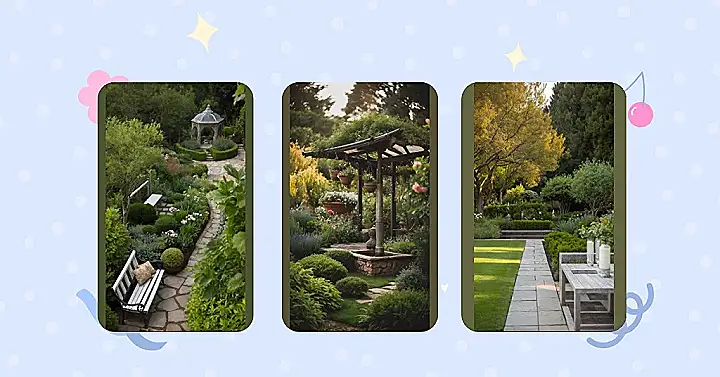 Then you’ve got the little fountain chilling out, probably whispering plant secrets to the nearby bushes about who needs the most water. Following the stepping stones feels like you’re on a secret mission through the green maze, leading to that awesome little hangout spot. It’s the kind of garden that makes you want to grab a comfy chair and just listen to the bees buzzing and the water trickling, maybe even have a dramatic conversation with a particularly leafy friend about the important things in life.