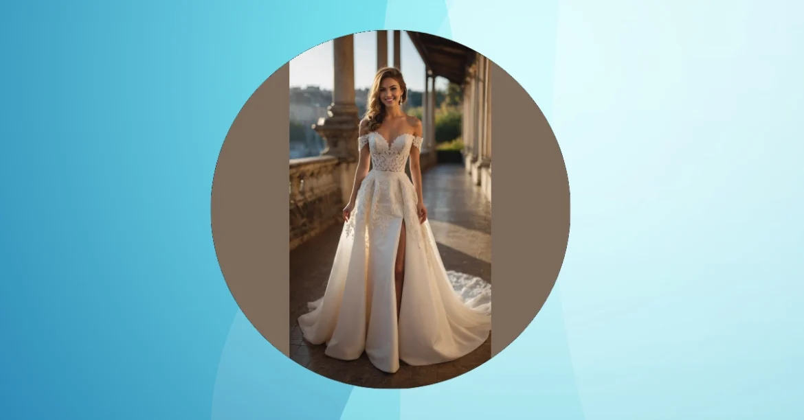 You know how sometimes you see a dress and just go, “Woah”? This wedding dress is definitely one of those! Our model here is absolutely rocking it, looking like she just stepped out of a fairytale with that gorgeous off-the-shoulder lace top and a smile that could melt glaciers. That defined waistline, almost like a subtle Basque style that dips just so, really makes the skirt flow out beautifully, giving off total main character vibes. It’s the kind of dress that says, “Yes, I’m elegant, but I’m also here to have an amazing time and probably sneak an extra slice of cake.”