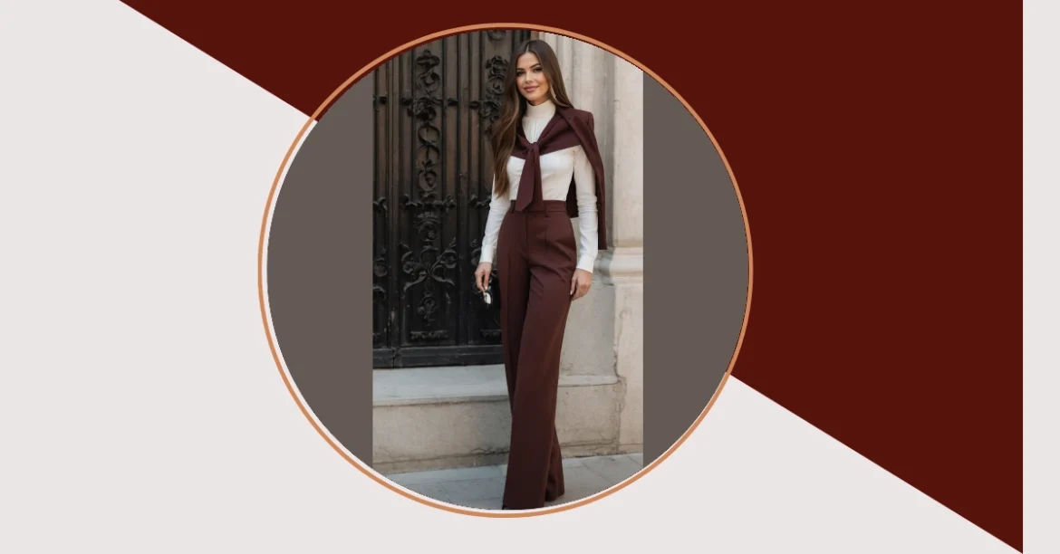And who knew wide-leg trousers could look this sharp? This outfit proves they’re not just for secretly smuggling snacks! Pairing those sleek brown trousers with a crisp white top and that cool matching blazer slung over the shoulders makes it look like you’re ready to conquer the world – or at least ace your next group project. It’s the kind of look that says, ‘I woke up like this, looking fabulous and ready for anything, even if “anything” means another pop quiz.’ Plus, the whole monochrome vibe with that pop of white just screams ‘fashion genius’ without even trying.