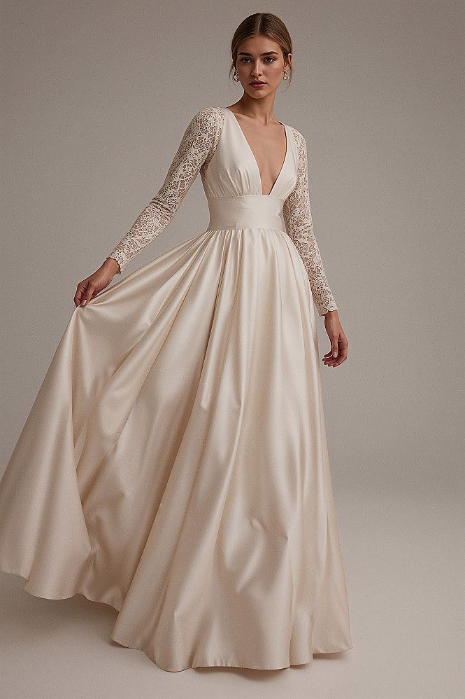 Featuring a delicate V-neck and three-quarter lace sleeves paired with a flowing satin A-line skirt, it’s the best dress for wedding events, offering both luxury and adaptable style.