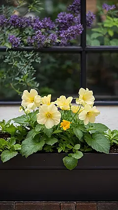Putting flowers in a box by your window is kind of a genius move, isn’t it? It’s like having your own personal cheering section made of petals and leaves, always ready to brighten your day. You’ve got the main yellow crew rocking the sill, and if you peek behind the glass, there are even some blurry purple party crashers in the background joining the vibe. It’s a whole mini-ecosystem designed to make your view less boring and way more flowery.