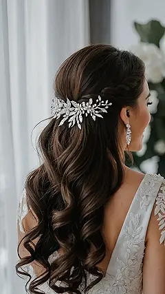 The image shows a gorgeous bride rocking winter-inspired bridal hair. Her flowing, curly locks are adorned with a delicate, dazzling hairpiece. It’s like something out of a fairy tale, right? This hairpiece is a perfect way to add a touch of magic to your winter wedding. Think snowflakes, frosty branches, and the shimmery magic of a winter night.
