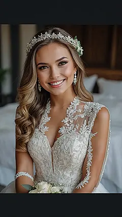 And let’s not forget that dazzling hair accessory! With its delicate flowers and sparkling little details, it’s giving off serious “enchanted winter garden” vibes – like tiny snowflakes landed perfectly on her head, but way more organized and sparkly. Paired with those chandelier earrings, she’s basically shimmering like a freshly fallen blanket of snow, only much warmer and definitely more comfortable. It’s the secret weapon for looking like a total queen without having to worry about actual ice crystals getting tangled in your fabulous locks.