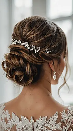 This updo isn’t just about avoiding a bad hair day; it’s a whole vibe! Notice how the sparkling headpiece twinkles, catching the light like fresh snow, and those dazzling teardrop earrings just scream ‘winter wonderland glam.’ It’s the perfect way to show off those gorgeous accessories without your hair trying to steal the spotlight. Plus, imagine dancing the night away without a single hair-related drama – no sweaty neck, no strands sticking to your lipstick, just pure, unadulterated bridal joy. It shows that even in the chilliest season, you can totally rock a warm smile and a hairstyle that’s as picture-perfect and sparkling as a fresh snowfall!