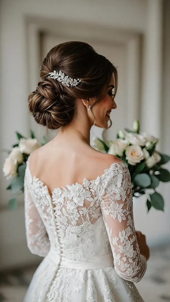 And because no winter wonderland look is complete without a little sparkle, check out that bling! Her hair accessory, with all its delicate pearls and crystals, totally gives off ‘freshly fallen snow that sparkles in the sun’ vibes. It’s the perfect touch for a winter bride who wants to shine brighter than a Christmas tree (but, you know, in a sophisticated way). Paired with those classic pearl earrings and that intricate lace dress, she’s basically saying, “I’m ready for my happily ever after, and my hair is here for the party, staying put and looking gorgeous, no matter how many happy tears are shed or how cold it gets!”
