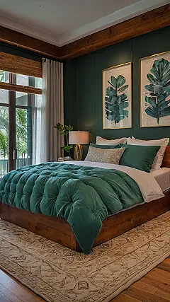 Seriously, though, who needs a vacation when you have this? The dark green walls are surprisingly calming, paired with the warm, inviting lighting and those cool art pieces. It’s like stepping into a peaceful rainforest at night. Plus, that bed looks unbelievably comfy – I bet you could spend a whole weekend there without moving, which honestly, sounds like a pretty good plan to me. Just add some rainforest sounds, and you’ve got yourself the ultimate relaxation station.